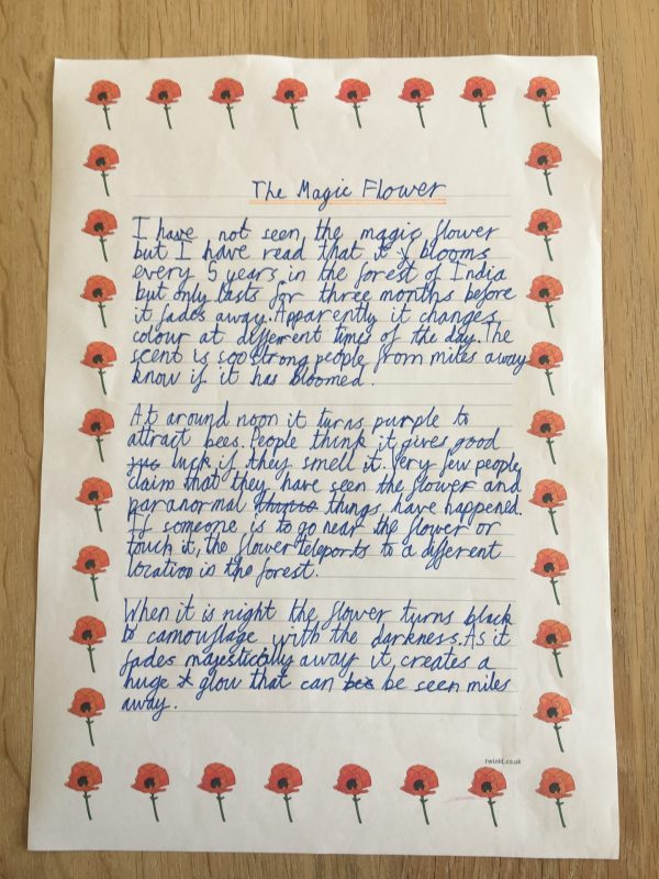 Fantastic writing from Oscar in year 4. Who would believe that Oscar couldn’t speak any English in year 1. Brilliant progress!!