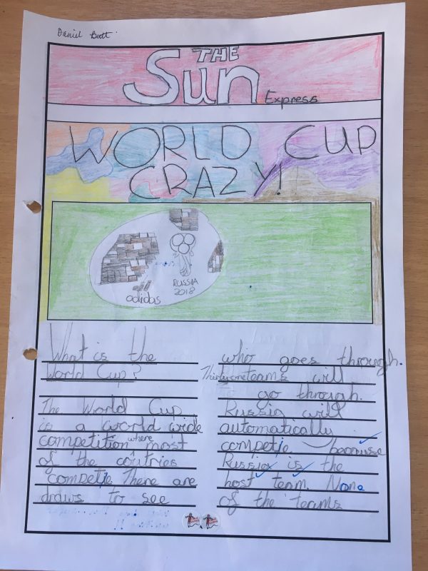 Dan’s World Cup Writing Well done to Dan (Year 3) for writing a newspaper article about the World Cup. Dan was a reluctant writer when he came to us and is now absolutely loving producing pieces of written work. We’re so proud of his progress.